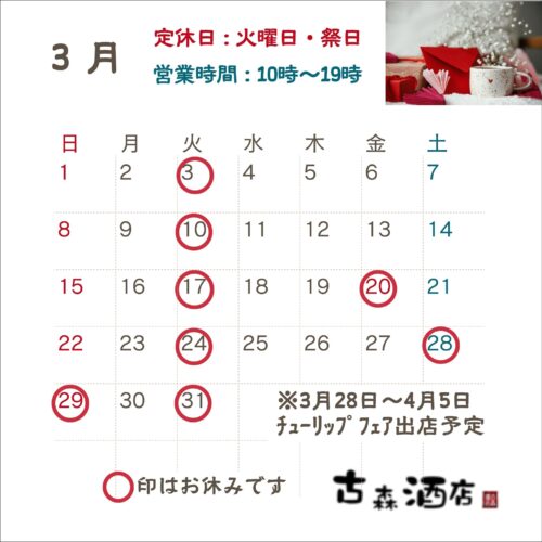 令和8年3月の営業日カレンダー 営業時間は10:00~19:00です。30日(月)は、チューリップフェア出店会場へ商品追加搬入のため、13:00~14:00まで一旦お店を閉めますのでご注意くださいませm(_ _)m