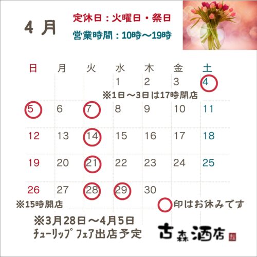 令和8年4月の営業日カレンダー 2日(木)~3日(金)は、チューリップフェア出店会場へ商品追加搬入のため、13:00~14:00まで一旦お店を閉めますのでご注意くださいませ。閉店は17:00となります。