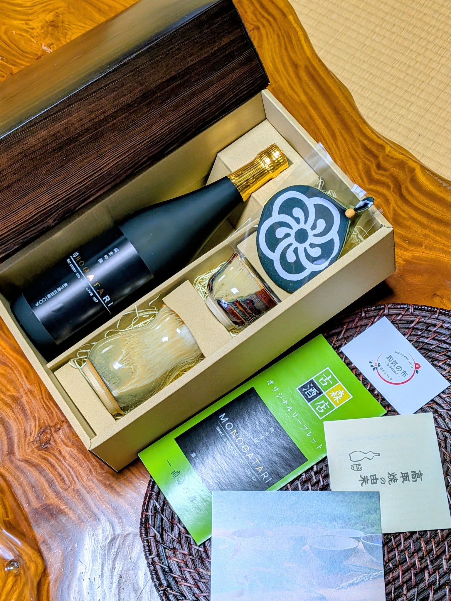 ◆コラボギフト◆【日本酒】直方酒MONOGATARI 720ml &【酒器】高取焼 直方永満寺窯 &【ねじ梅コースター】和気の布 直方特産ギフト